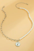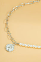 - Quiet, confident and sculptural: one half of luminous faux pearls, one half of sleek chain with a coin at the centre featuring Her Majesty.